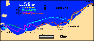 This photo was taken on the last leg of our summer cruise on the way from Rocky River, OH to Fairport, OH. We were just off Cleveland in 25-30 knots of wind and 2-4 foot waves. We were routinely surfing to 8+ knots and were hitting mid 9's regularly enough for me to get my camera out and take this photo (you can see my shadow). Just before I shot this we caught a surf to 10.3. The apparent wind display can be seen with the wind at 150 degrees apparent and the knotmeter just below showing about 9.5. The boat was very stable and easy to control. The waves were not big enough to cause steering problems but just right for great surfs. The wind gusted up to about 30 knots for 50 seconds or so every 4 - 5 minutes. It was very consistent. We were flying the full main and a 130.