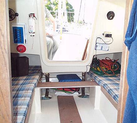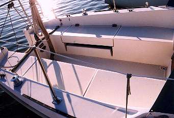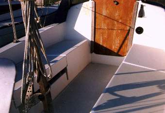 | The companionway of the Weekender and One Design is not off center as on the standard P26. There is no cut out at the front of the starboard cockpit seat. The 1/4 berths extend under the forward cockpit seats. This photo is 1981 P26OD #232. |