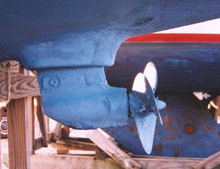 | At least one P26 was fitted with an inboard engine. This OD (#232) has a primitive looking sail drive unit about 3 feet ahead of the rudder. |