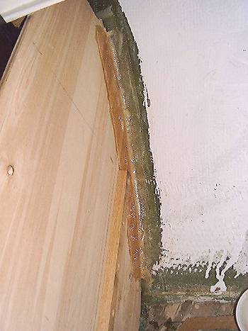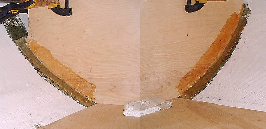 | This photo shows the forward bulkhead of the locker glassed in on top of the 5" wide pad. The bulkhead is made from 1/2" plywood. |