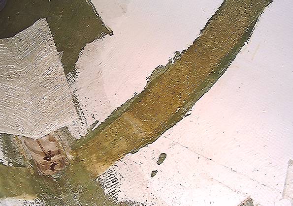 | I layed in a 5" wide and 1/4 to 3/8" thick layer of mat where the the forward bulkhead of the locker would be glassed in. |