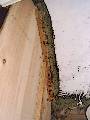 | At the left side of the cutout the v-berth bulkhead is cored with plywood. The fiberglass panel is not bonded to the plywood. In the photo I jammed a screw driver in to show how it's not bonded. I'll squeeze in some epoxy here. |