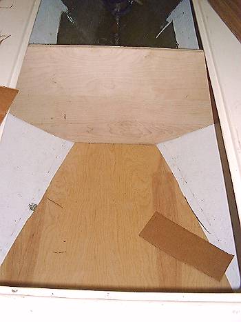 5/15/01 - I put this project on hold last season but got back to it now. The floor has been trimmed and a forward bulkhead has been made from the same 1/2" plywood. It seperates the locker space from the holding tank space. A small forward bulkhead and a bottom for the holding hank space have been made. Some trimming needs to be done and then glass work.