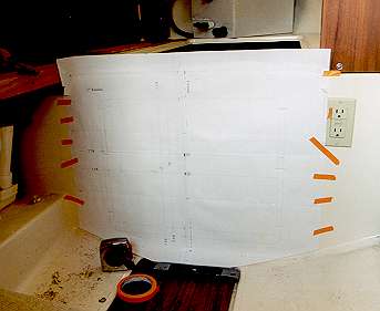 | To transfer the lines for the cut-out on to the v-berth bulkhead I made a print of the cut-out drawing at full scale. I taped the paper to the bulkhead and marked it through small slots in the paper along the line. Then I connected these marks with a pencil line. I drilled some small holes and fit the jig saw blade in for the cut. |