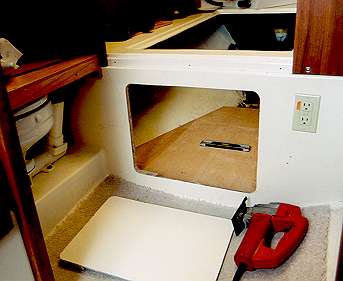 | The cut-out is big enough to crawl through. The bottom of the cut-out sits about 2" above the bottom of the new locker floor and about 3" above the cabin floor. The plywood locker floor panel can be seen through the cut-out. I'll trim the cut-out with wood, probably oak because I already have some and this is inside the boat. |