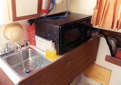 This photo shows the faucet installed at the galley sink. The lefthand knob is filtered, the right un-filtered. The small spigot connects to a foot pump that's fed from the water tank. This photo also shows the microwave I installed outboard of the sink. It is fastened to the counter top.
