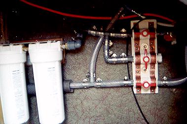 | This is a rather crude photo showing the filter installation and the valves for the system. The bottom valve is inlet, the middle is the feed to the water tank, the top is the feed to the faucet in the gally sink. There is also an un-filtered feed to the sink that taps off after the inlet valve in the middle of the photo.