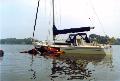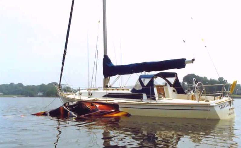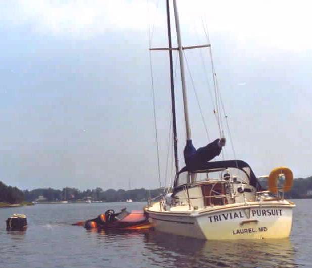 This is the view from astern. The name can be seen clearly now and compared with that in the brochure. My friend changed the home port to his address from that of Pearson (Grumman). Note that the stern ladder is deployed and underwater. Both of these boats are setting on the bottom. This accident happened on July 3, 1988, in the evening as TP was about to turn into the Islands anchorage off of the Rhode River south of Annapolis, MD.