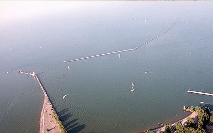 This is a view of Fairport Harbor looking east. The mouth of the Grand river is at the lower right of the picture.