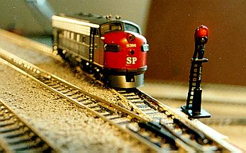 This is my Kato Southern Pacific f7 locomotive. This was the first quality locomotive I got. It has a flywheel drive and can pull more cars then any of the other loco's I have including the E8. The signal to the right of the locomotive has 2 very small LEDs in it. The ladder on the back of the signal is made from the wires that power the LEDs. The signal is changed from red to green by reversing the polarity.